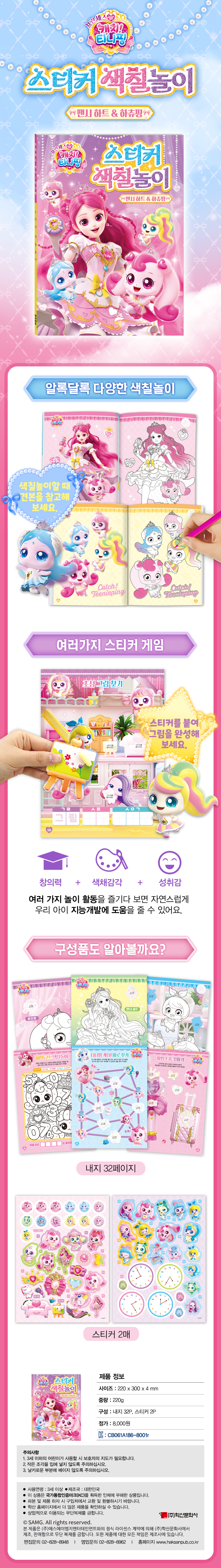 프린세스 캐치 티니핑 스티커 색칠놀이 - 팬시 하트&하츄핑 캐릭터팀 색칠놀이북 0 13800 2020.04.24 09:23 프린세스 캐치 티니핑 스티커 색칠놀이 - 팬시 하트&하츄핑 가격 8,000원 사이즈 220 X 300 X 4 mm 구성 스티커 2장, 내지 32p 중량 220 g 제조년월 2025-10-24 제조국 대한민국 판매처 교보문고 예스24 알라딘 이전 상품 다음 상품 설명문구 알록달록 그림을 색칠하고 스티커를 붙이며 놀아요! 상세이미지 알록달록 그림을 색칠하고 스티커를 붙이며 놀아요!