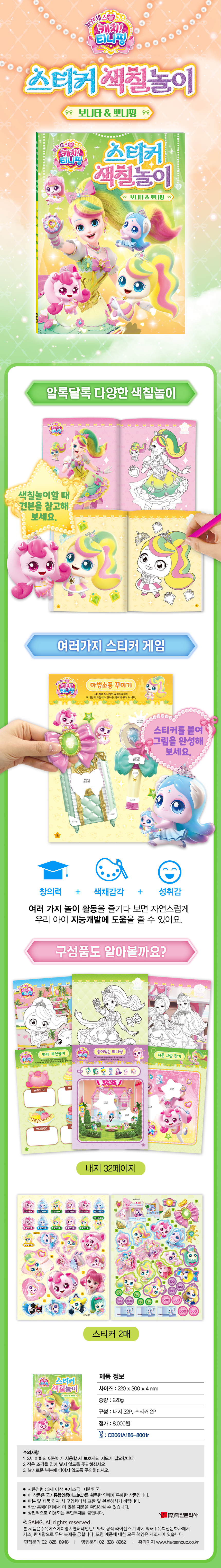 프린세스 캐치 티니핑 스티커 색칠놀이 - 보니타&뽀니핑 캐릭터팀 색칠놀이북 0 13567 2020.04.24 09:23 프린세스 캐치 티니핑 스티커 색칠놀이 - 보니타&뽀니핑 가격 8,000원 사이즈 220 X 300 X 4 mm 구성 스티커 2장, 내지 32p 중량 220 g 제조년월 2025-11-06 제조국 대한민국 판매처 교보문고 예스24 알라딘 다음 상품 설명문구 알록달록 그림을 색칠하고 스티커를 붙이며 놀아요! 상세이미지 알록달록 그림을 색칠하고 스티커를 붙이며 놀아요!