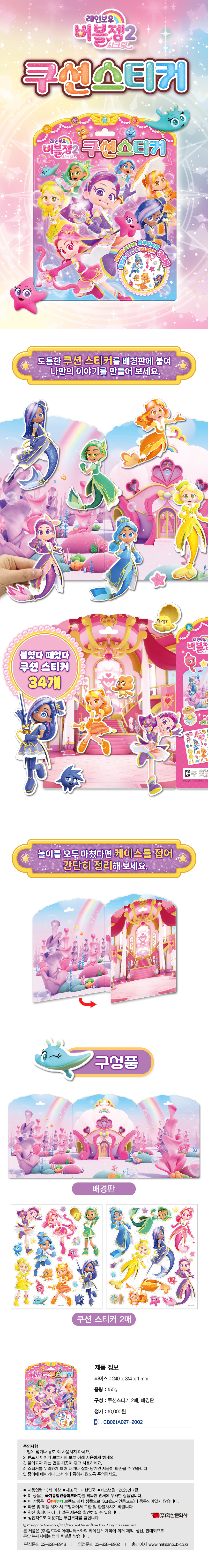 레인보우 버블젬 시크릿 쿠션스티커 캐릭터팀 스티커북 0 9217 2023.12.15 10:44 레인보우 버블젬 시크릿 쿠션스티커 가격 10,000원 사이즈 240X314X1 구성 케이스(배경판), 쿠션스티커 2매 중량 150g 제조년월 2025-07-16 제조국 대한민국 판매처 교보문고 예스24 알라딘 이전 상품 다음 상품 설명문구 붙였다 떼었다 말랑말랑 쿠션스티커! 상세이미지 붙였다 떼었다 말랑말랑 쿠션스티커!