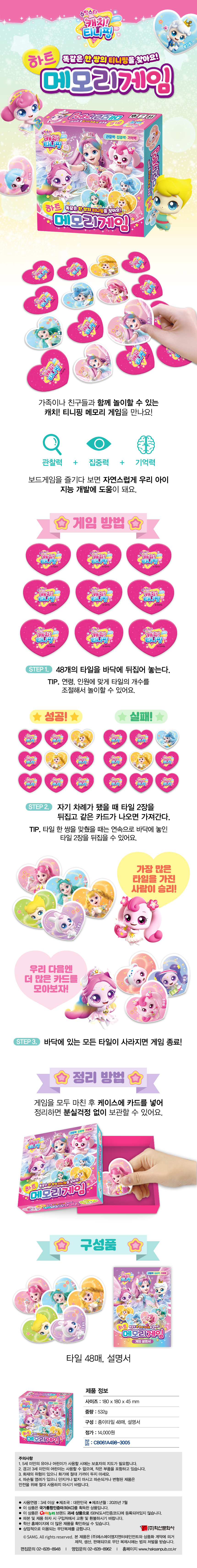 슈팅스타 캐치 티니핑 시즌5 하트 메모리게임 캐릭터팀 보드게임 0 15458 2020.05.15 09:24 슈팅스타 캐치 티니핑 시즌5 하트 메모리게임 가격 14,000원 사이즈 180X180X45 mm 구성 종이타일 48장, 설명서 중량 532 g 제조년월 2025-07-23 제조국 대한민국 판매처 교보문고 예스24 알라딘 이전 상품 다음 상품 설명문구 누구보다 빠르게 똑같은 그림을 찾아라! 상세이미지 누구보다 빠르게 똑같은 그림을 찾아라!