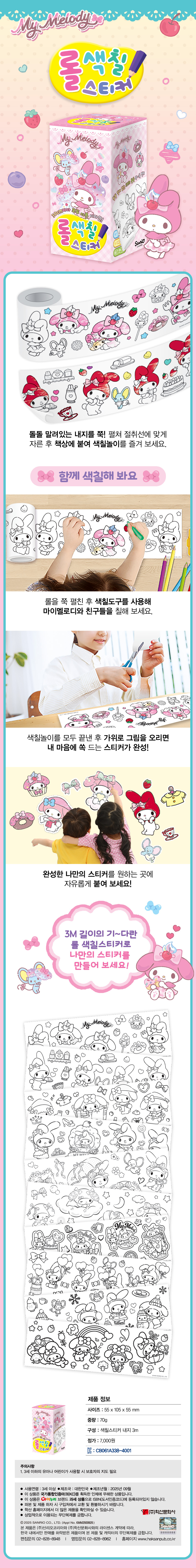 산리오캐릭터즈 마이멜로디 롤 색칠스티커 - Sweet Land 캐릭터팀 색칠놀이 0 7169 2023.12.15 10:11 산리오캐릭터즈 마이멜로디 롤 색칠스티커 - Sweet Land 가격 7,000원 사이즈 55 X 105 X 55 mm 구성 3m 길이의 롤 색칠스티커 중량 70g 제조년월 2025-09-04 제조국 대한민국 판매처 교보문고 예스24 알라딘 이전 상품 다음 상품 설명문구 돌돌 말려있는 롤을 쭉 펼치면 색칠놀이가 가득! 상세이미지 돌돌 말려있는 롤을 쭉 펼치면 색칠놀이가 가득!