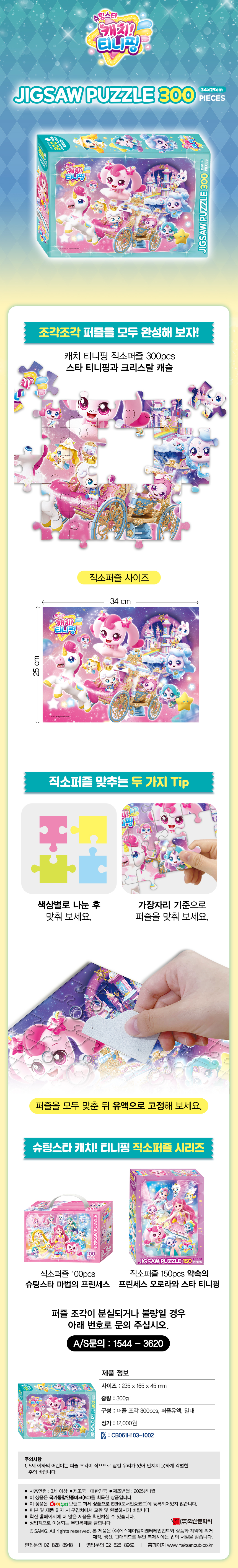 슈팅스타 캐치 티니핑 시즌5 직소퍼즐 300PCS 스타 티니핑과 크리스탈 캐슬 캐릭터팀 직소퍼즐 0 16358 2020.05.08 09:44 슈팅스타 캐치 티니핑 시즌5 직소퍼즐 300PCS 스타 티니핑과 크리스탈 캐슬 가격 12,000원 사이즈 235X165X45 mm 구성 300 퍼즐조각, 유액, 밀대, A/S신청서 중량 300 g 제조년월 2025-01-17 제조국 대한민국 판매처 교보문고 예스24 알라딘 다음 상품 설명문구 캐릭터 직소퍼즐로 우리아이 두뇌가 쑥쑥! 상세이미지 캐릭터 직소퍼즐로 우리아이 두뇌가 쑥쑥!