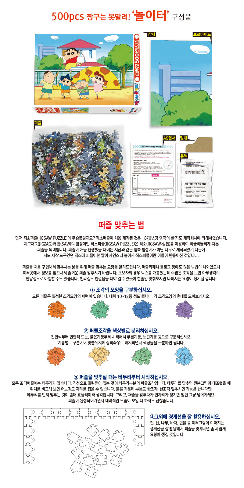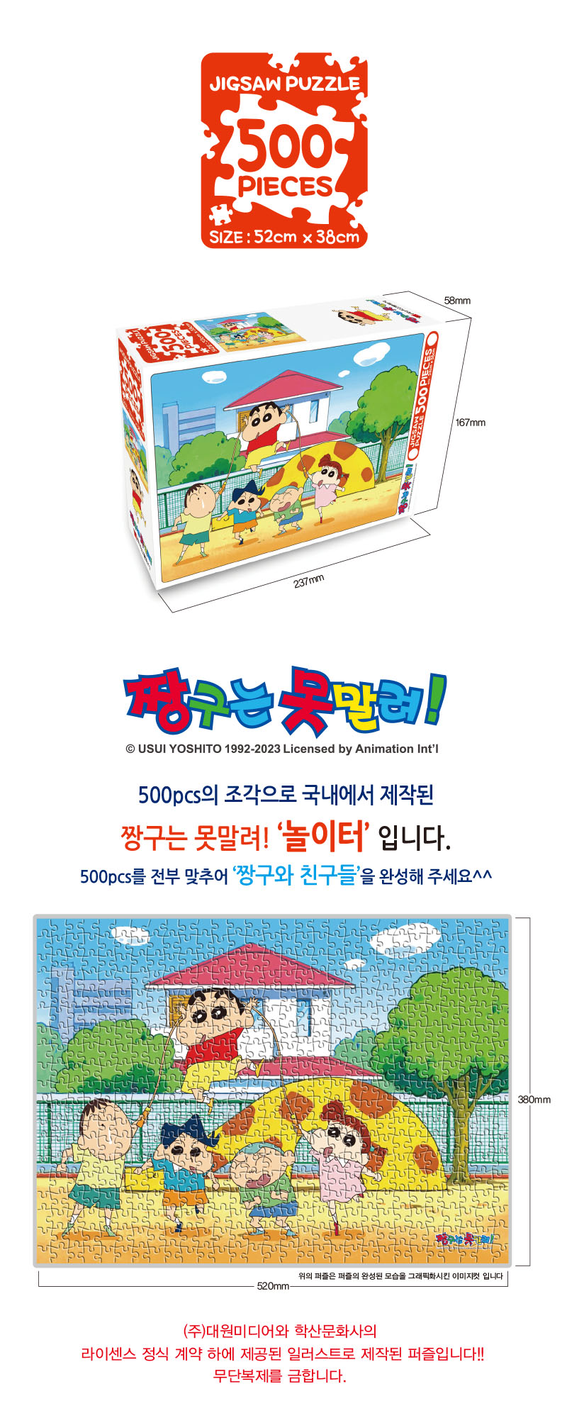 짱구는 못말려! 직소퍼즐 500pcs 놀이터 캐릭터팀 0 5483 2023.09.07 09:43 짱구는 못말려! 직소퍼즐 500pcs 놀이터 가격 15원 사이즈 박스 : 237X167X58(mm) / 퍼즐&브로마이드 : 520x380(mm) 구성 박스, 퍼즐, 브로마이드, AS엽서, 밀대, 유액 중량 570g/290g 제조년월 2024-02-15 제조국 대한민국 판매처 이전 상품 다음 상품 설명문구 상세이미지